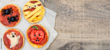 Halloween mini pizza with cheese, olives and ketchup. Funny food for children. Decorated mummy, ghost, spiders, zombie. Background of an old wood