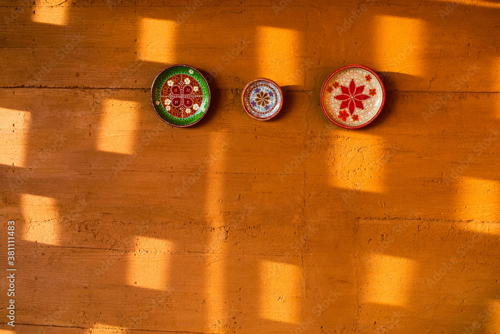 Red terracotta color clay wall with handmade souvenir plates as decoration. Moroccan culture, traditional interior design in Morocco. Beautiful sun light.