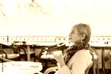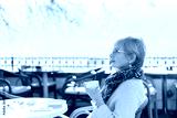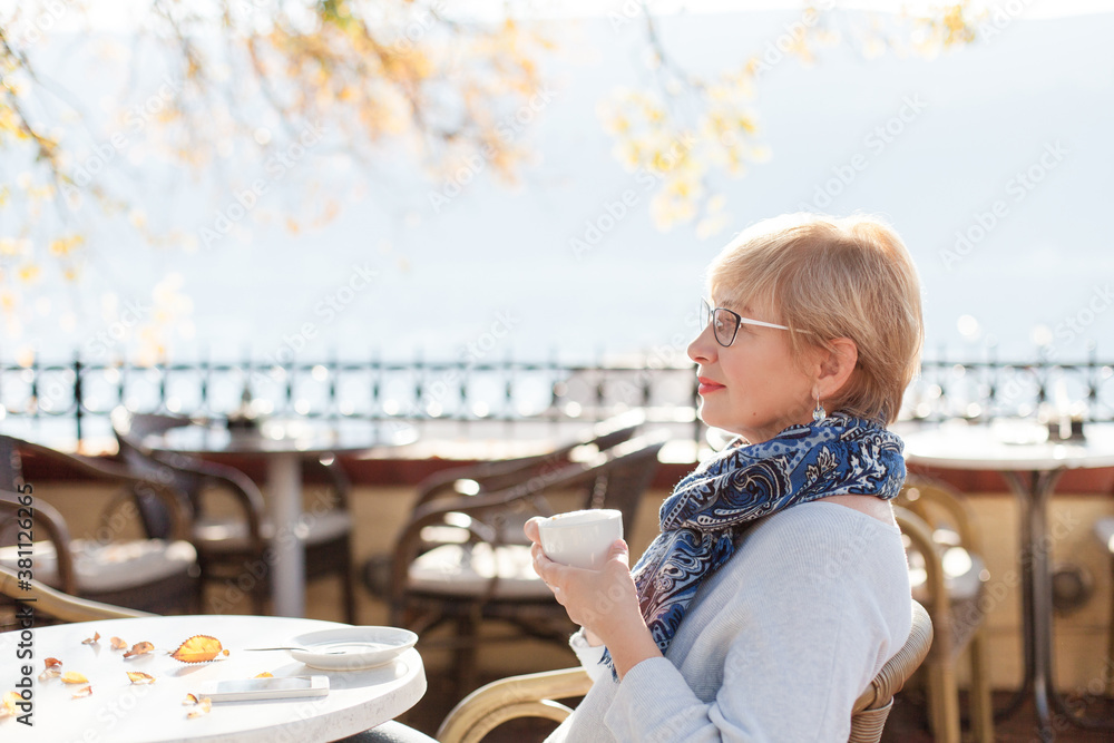 Senior woman in cozy autumn cafe outdoors. Retired stylish lady drinking morning coffee and enjoying fall sunny weather. Concept of wellbeing, Indian summer, life satisfaction. Lifestyle moment.