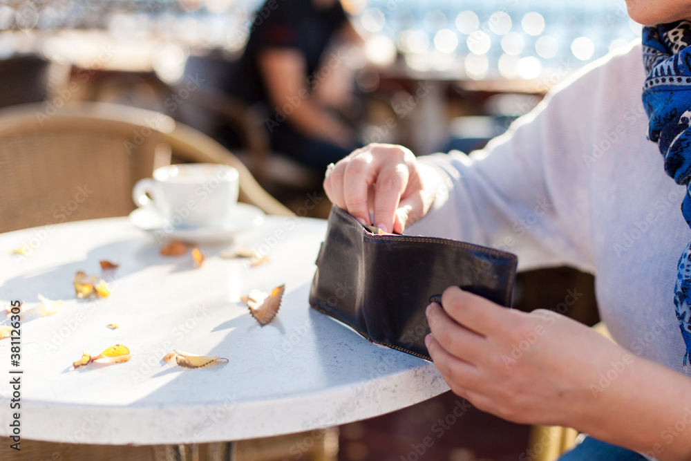 Senior woman pays money in autumn cafe outdoors. Payment for coffee in restaurant. Retired lady holding wallet with cash. Close up of female hands.