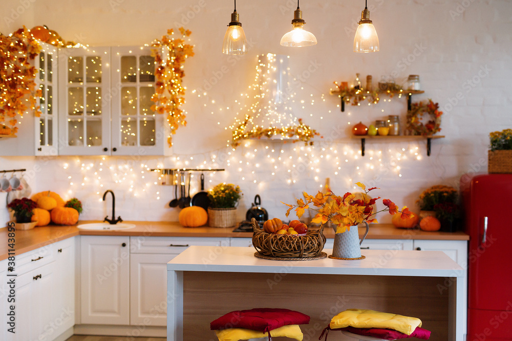 Autumn kitchen interior. Red and yellow leaves and flowers in the vase and pumpkin on light background
