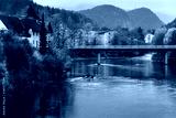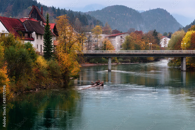 Wonderful landscape of mountain village in fall. View of forest with yellowed foliage, which reflects in water. Fussen. Lech river. Bavaria. Germany.