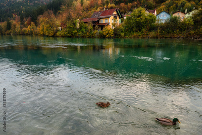 Wonderful landscape of mountain village in fall. View of forest with yellowed foliage, which reflects in water. Fussen. Lech river. Bavaria. Germany.