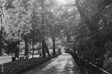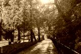 Amazing landscape of autumn season park. Glowing with some effect In morning at park. Yellow trees and fallen leaves. Wroclaw, Poland. Colorful toning effect.