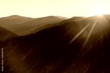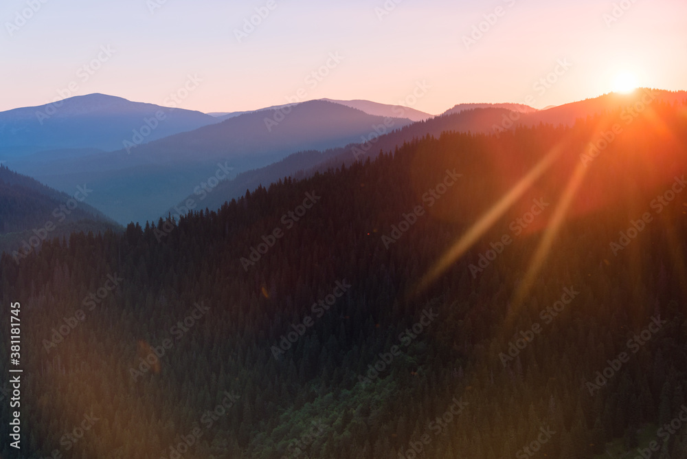 Great view of colorful sunrise in the mountains backlight glow against the sunlight with sun flare and bokeh. Concept of the awakening wildlife, emotional experience in your soul. Retro effect.
