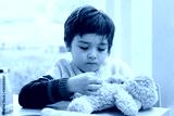 High key light portrait cute boy plying teddy bear on table, Adorable Child playing with toys and relaxing while waiting for food in cafe.