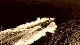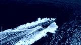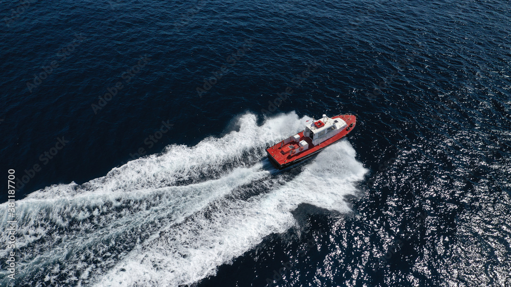 Aerial drone photo of red pilot boat cruising in high speed in Mediterranean deep blue sea offering navigational aid to ships
