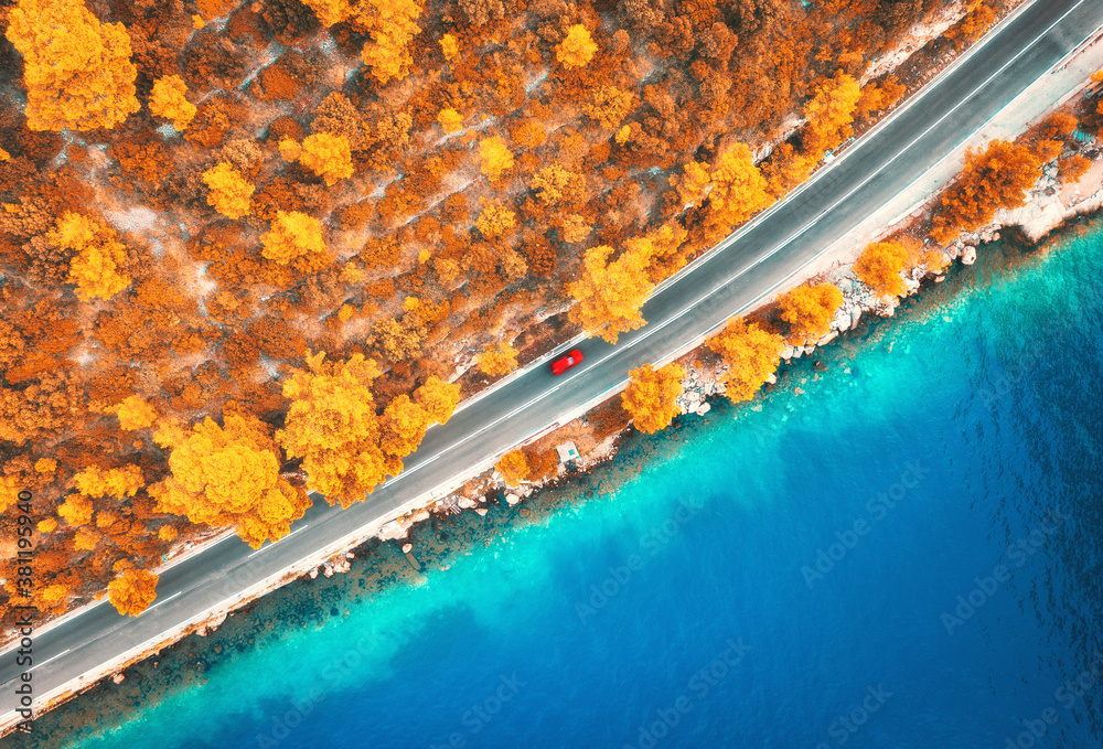 Aerial view of road in beautiful orange forest and blue sea at sunset in autumn. Colorful landscape with roadway, blurred cars, clear water, trees in fall. Top view of road along the sea coast. Travel