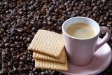 Cup of hot espresso coffee and biscuits on coffee beans dark background.
