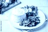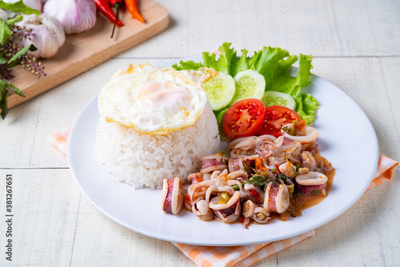 Rice topped with stir-fried Octopus dollfusi and basil with Sunny side up egg.Thai food