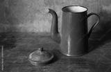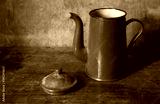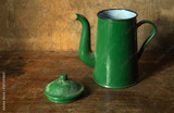 Green metal enamel teapot on an old wooden table