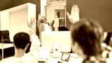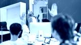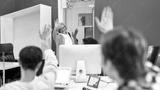 Cheerful aged woman, senior intern waving, saying goodbye to her young colleagues while leaving office after first day at work