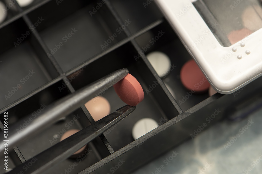 The tablet is taken with tweezers from the daily medical organizer, close-up, selective focus. Concept: treatment at home, taking medication on time.