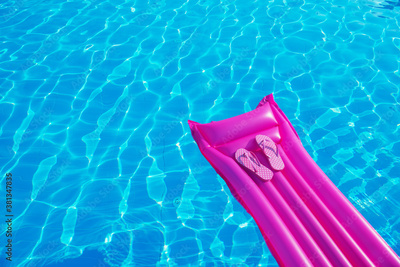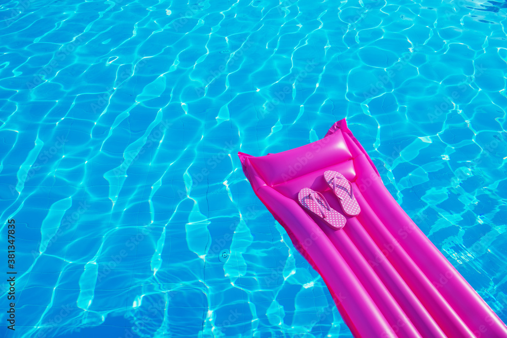 Beach summer holiday background. Inflatable air mattress, flip flops on swimming pool.
