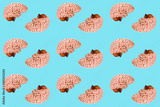 pop art poster multicolored scattered models of the human brain, seamless background, the concept of mind, intelligence, ideas