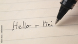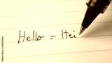 Beginner Finnish or Norwegian language learner writing Hello word Hei for homework on a notebook