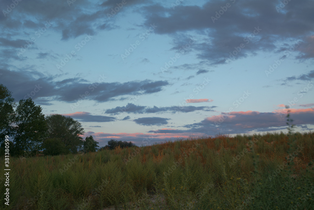 krajobraz drzewa liście natura zieleń przyroda barwy zachód słońca niebo chmury trawa zieleń błękit pomarańcz