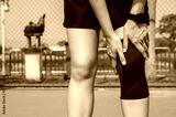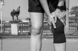 Runner woman holding her knee while she having suffering from knee pain and she wearing knee braces for supports to be worn when you have pain in your knee.