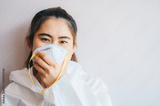 Asian woman holding a mask before wearing it with copy space. Conceptual of new normal lifestyle after Covid-19 pandemic outbreak.