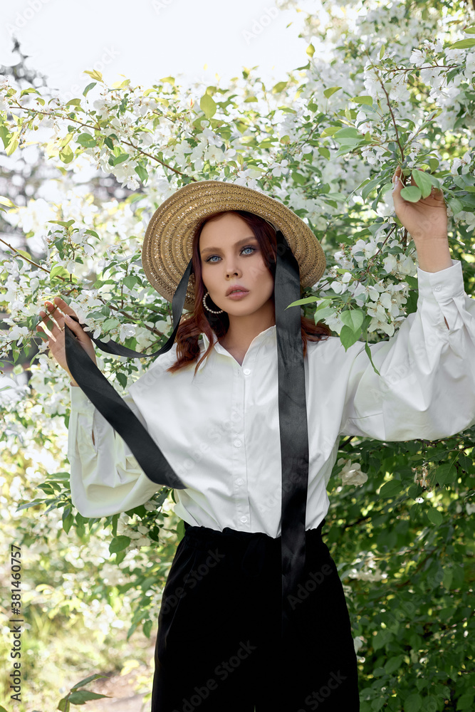 Beautiful girl in a hat in spring in the branches of flowering Apple bushes. Portrait of a woman on a bright summer day
