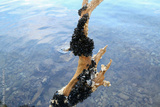 Sea waves wash wild mussels in a sunken tree