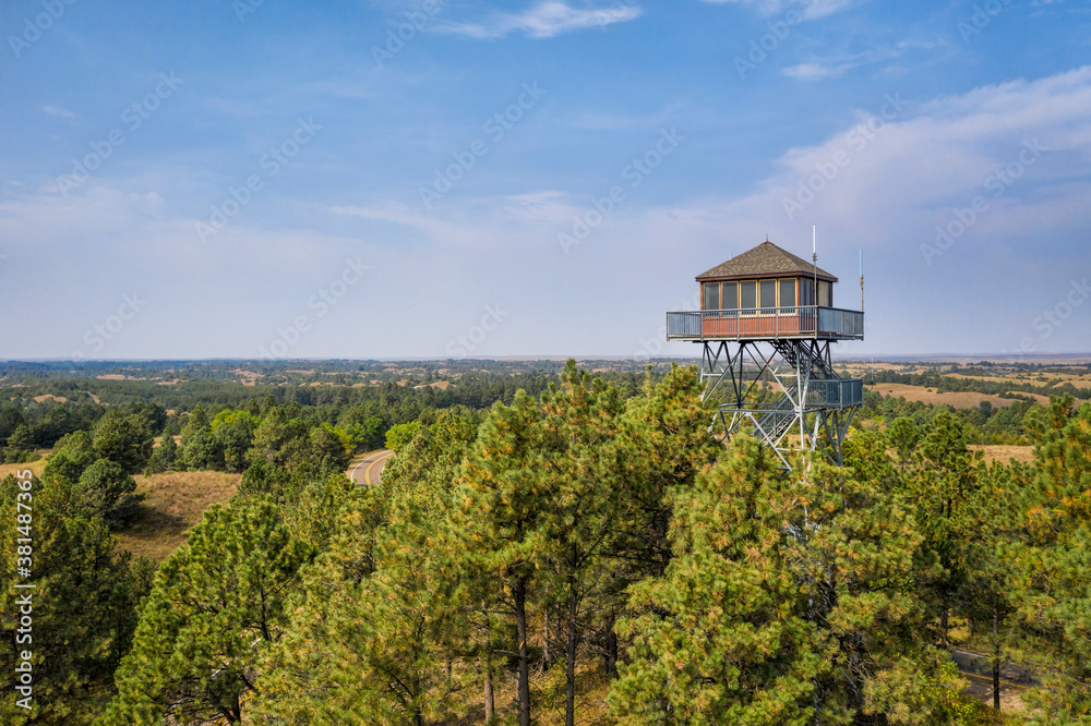 lookout tower in Nebraska National Forest, aerial view of early fall scenery, travel concept