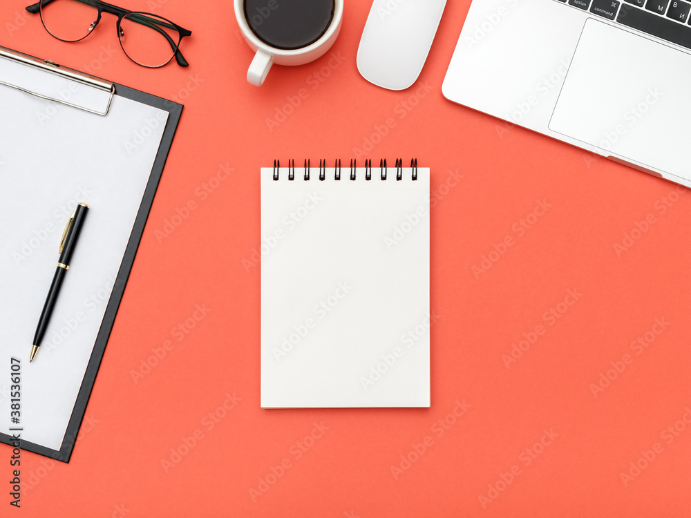 White designer office desk table with blank notebook page