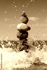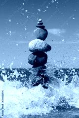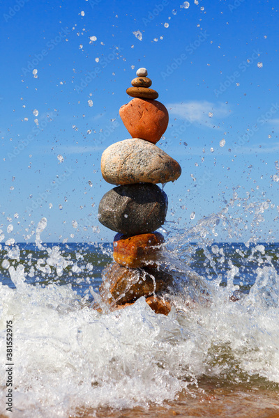 Rock zen pyramid of colorful pebbles standing in the water on the background of the sea and waves.