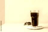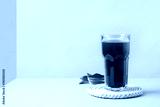 Chlorella Detox drink in glass on modern beige background as cube. Close up.
