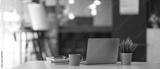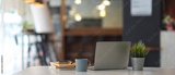 Worktable with laptop, supplies, stationery and plant pot in office room