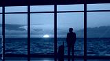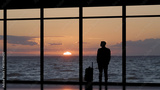 The man with a suitcase standing near a panoramic window against the sea sunset