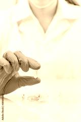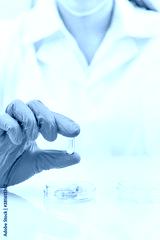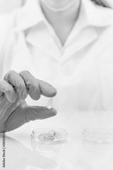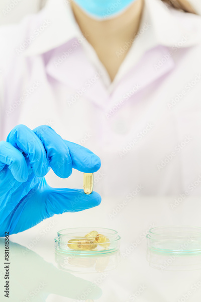 Scientist hands putting in nitrile blue latex gloves holding Omega 3 capsule in labcoat
