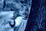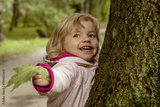 Street portrait of a laughing little girl holding an autumn maple leaf in her hand and hugging a tree. Concept: unity with nature, good mood in children.