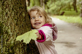 Street portrait of a little girl holding an autumn maple leaf and hugging a tree. Concept: unity with nature, good mood in children.
