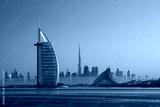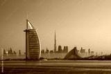 Dubai city - amazing city center skyline and famous Jumeirah beach at sunset, United Arab Emirates