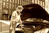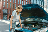 Attractive young woman examining, looking at her broken car with open hood while standing on the city street