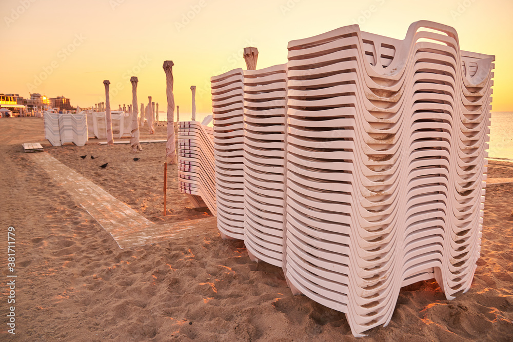 Folded sun loungers and umbrellas on the sea beach at sunrise.