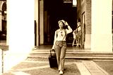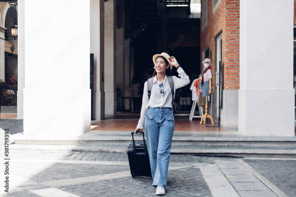 Asian woman beaming carrying a suitcase black to travel on vacation, Trolley bag, Long weekend travel, Love the trip, Tourism festival concept.