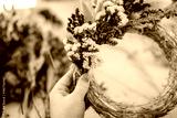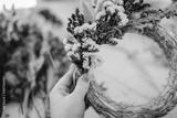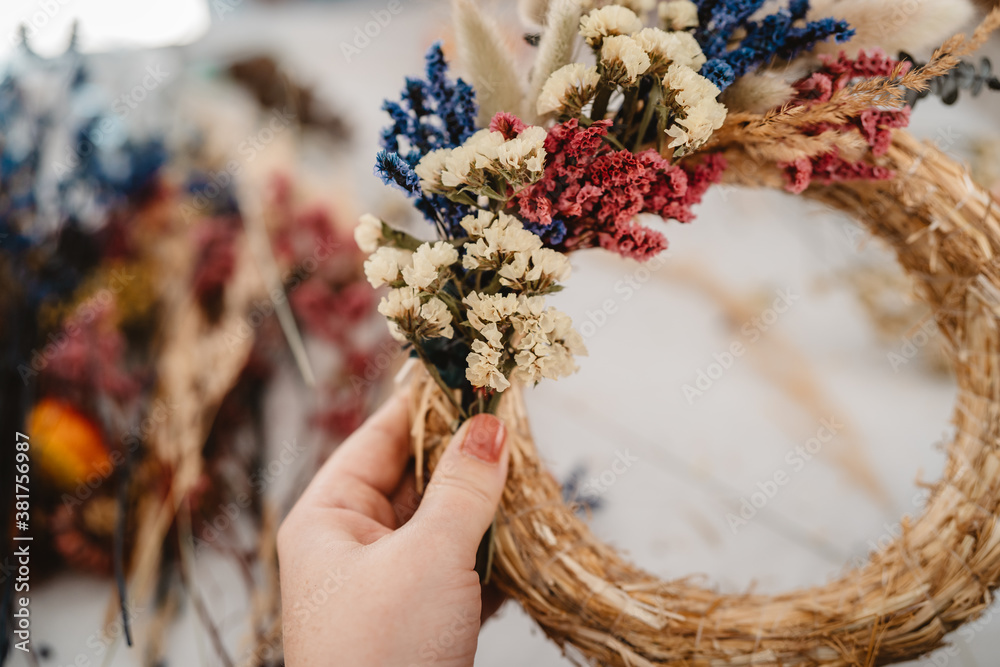 Girl making floral door wreath from colorful dry summer flowers and plants. Fall flower decoration workshop