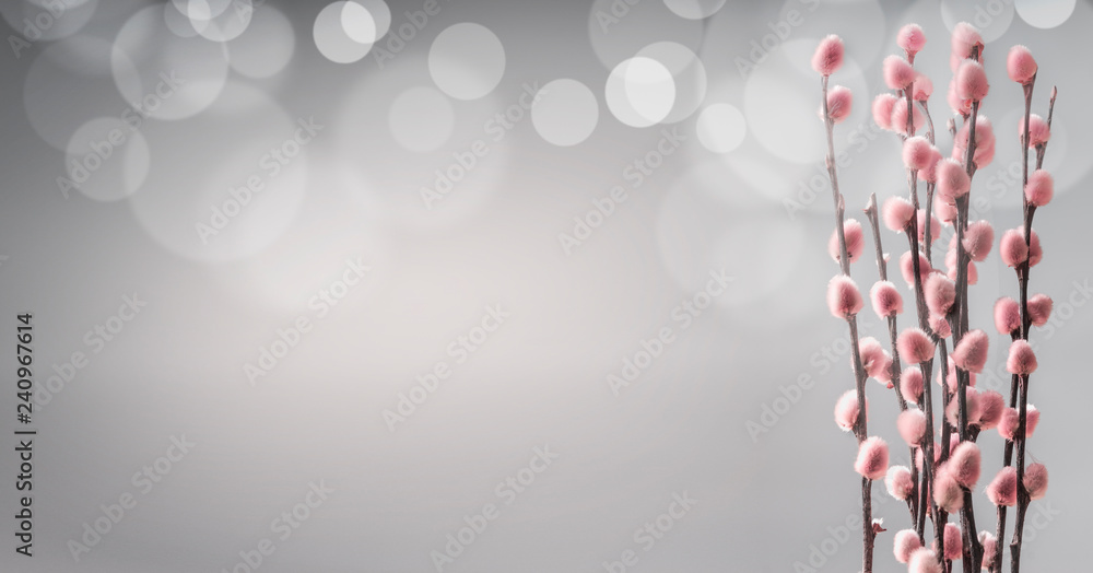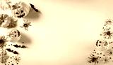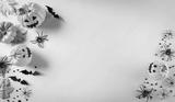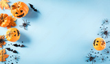 Halloween decorations made from pumpkin, paper bats and black spider on pastel blue background. Flat lay, top view with copy space for text.