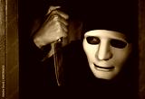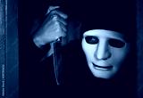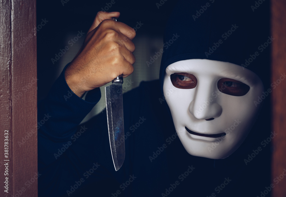 An unidentified man with a sharp knife hiding behind the door, waiting for his victim. Conceptual of a person who commits a crime.