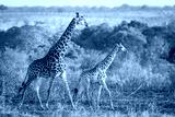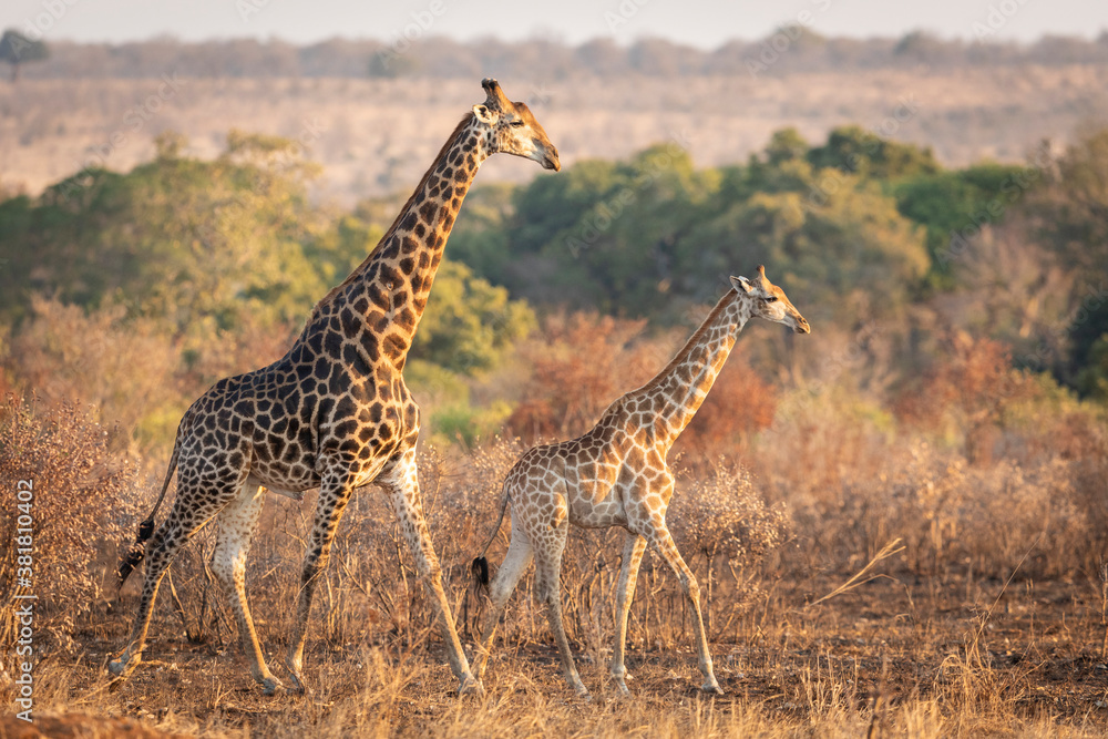 Male and female mating giraffes walking together in late afternoon in Kruger Park in South Africa