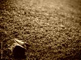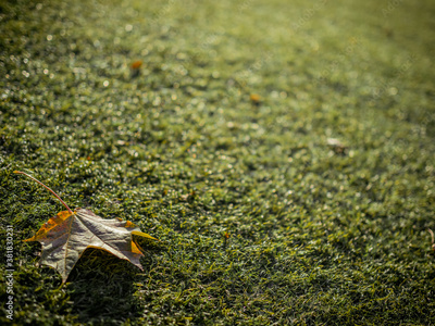 Close up image of fallen maple leaf lying on a school football field with astroturf. Closeup photo of artificial fibres of a green synthetic grass on a soccer field with warm autumn sun light.