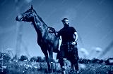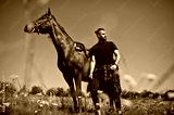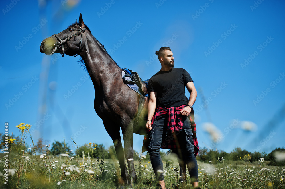 Arab tall beard man wear in black with arabian horse.
