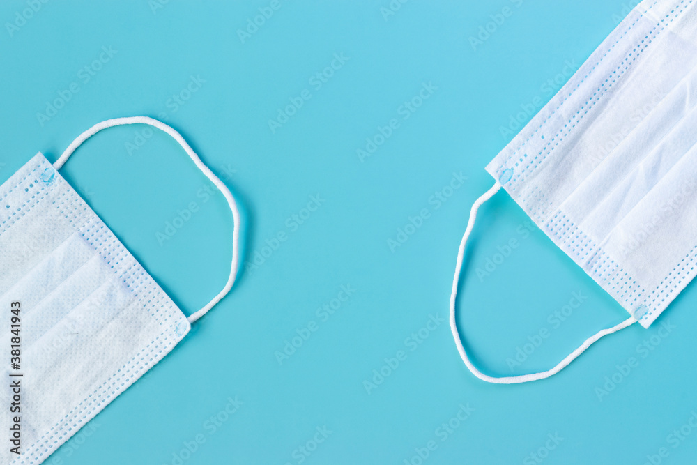 Protective medical masks on a blue background. Medicine concept. Quarantine and virus. Means of protection against respiratory diseases. Flat lay.
