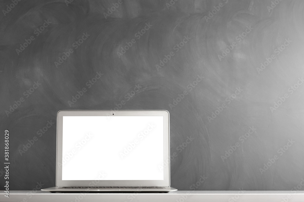 modern laptop computer on the tabl on the blackboard background