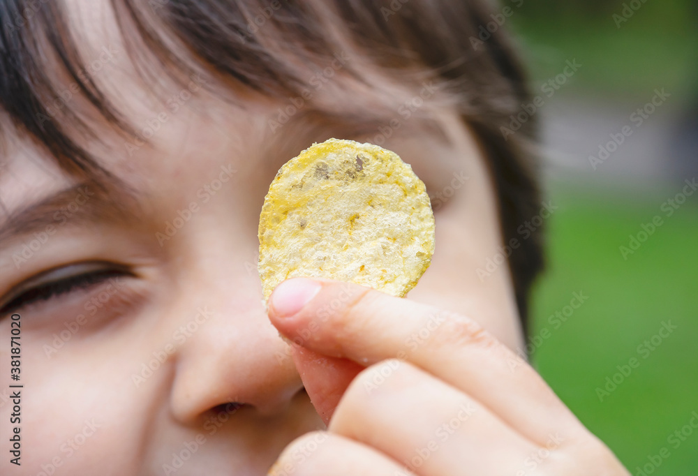 Cropped shot kid showing potato chips, Selective focus face of happy boy looking at fired potato, Close up Child eating potato crisp for his snack.