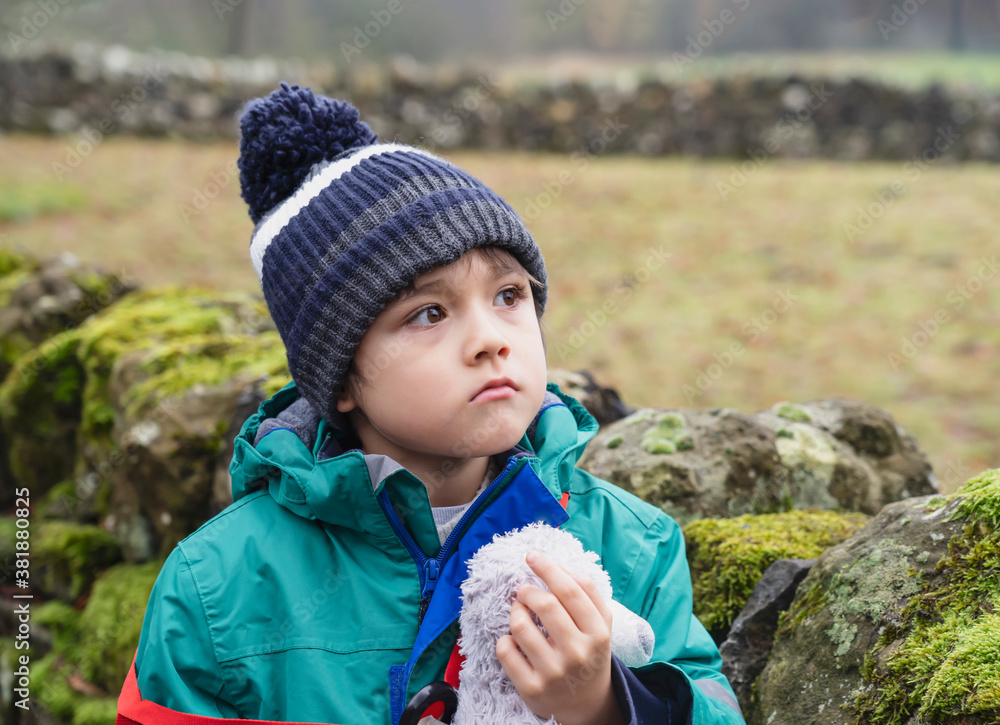 Portrait of School kid taking teddy bear explore with his learning history, Happy child boy wearing warm cloths holding his soft toy sitting on old brick wall with blurry ruins of old abbey background