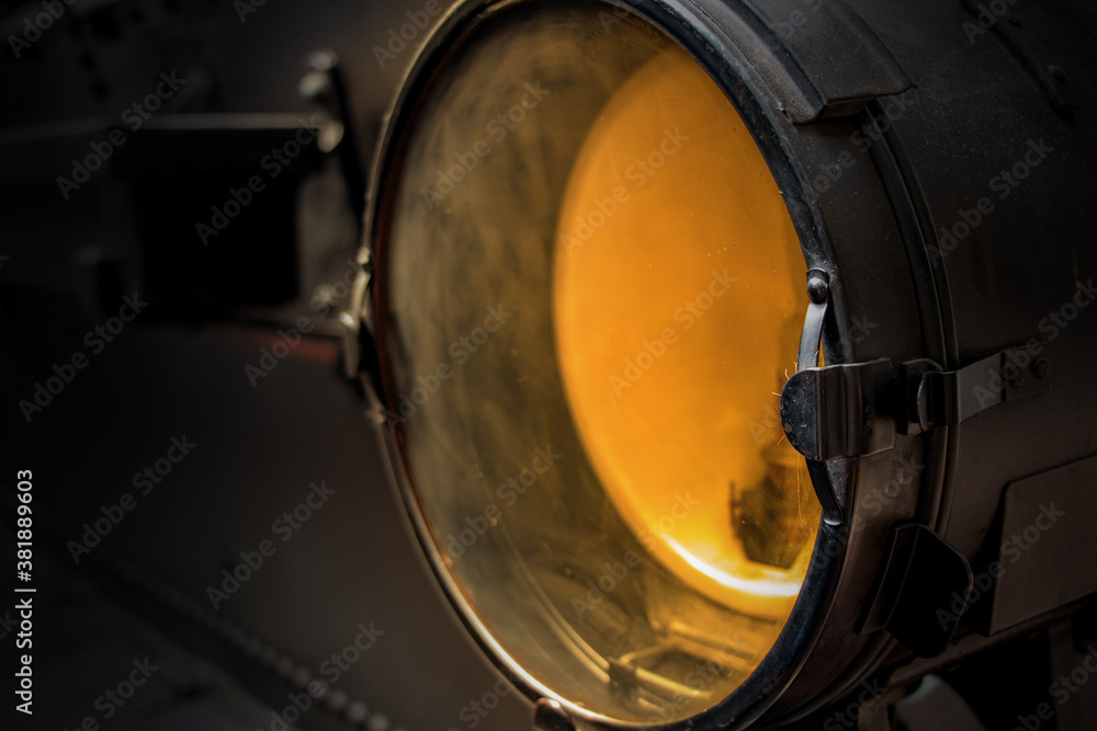 An old lamp of a steam locomotive shines to forward on track. Retro light in front part of train.