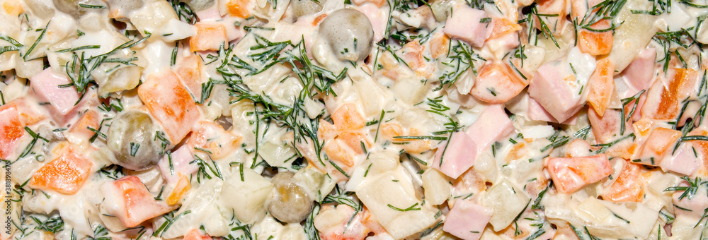 Delicious salad Olivier as background, top view.The texture of the salad Olivier.